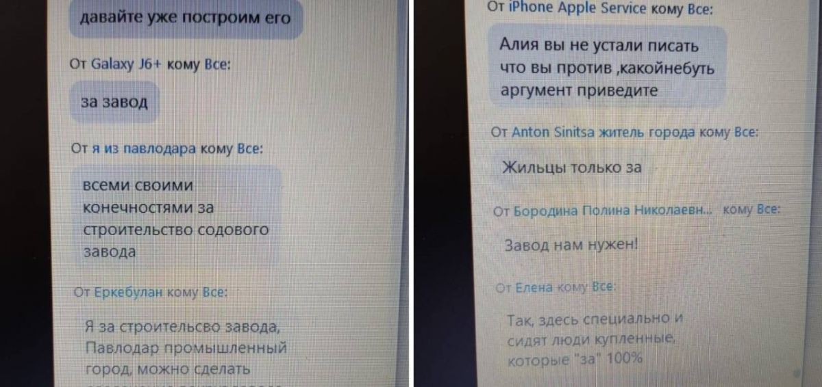 Несмотря на то, что на слушаниях не принимают решения о реализации проекта голосованием, определенная группа людей продолжала атаковать чат фразами, что они «за». А во время того, как участникам слушаний дали возможность задавать вопросы, в адрес тех, кто интересовался воздействием завода на окружающую среду, сыпались оскорбления и обвинения в том, что это проплаченные зарубежные конкуренты не дают возможность развиваться павлодарскому предприятию.